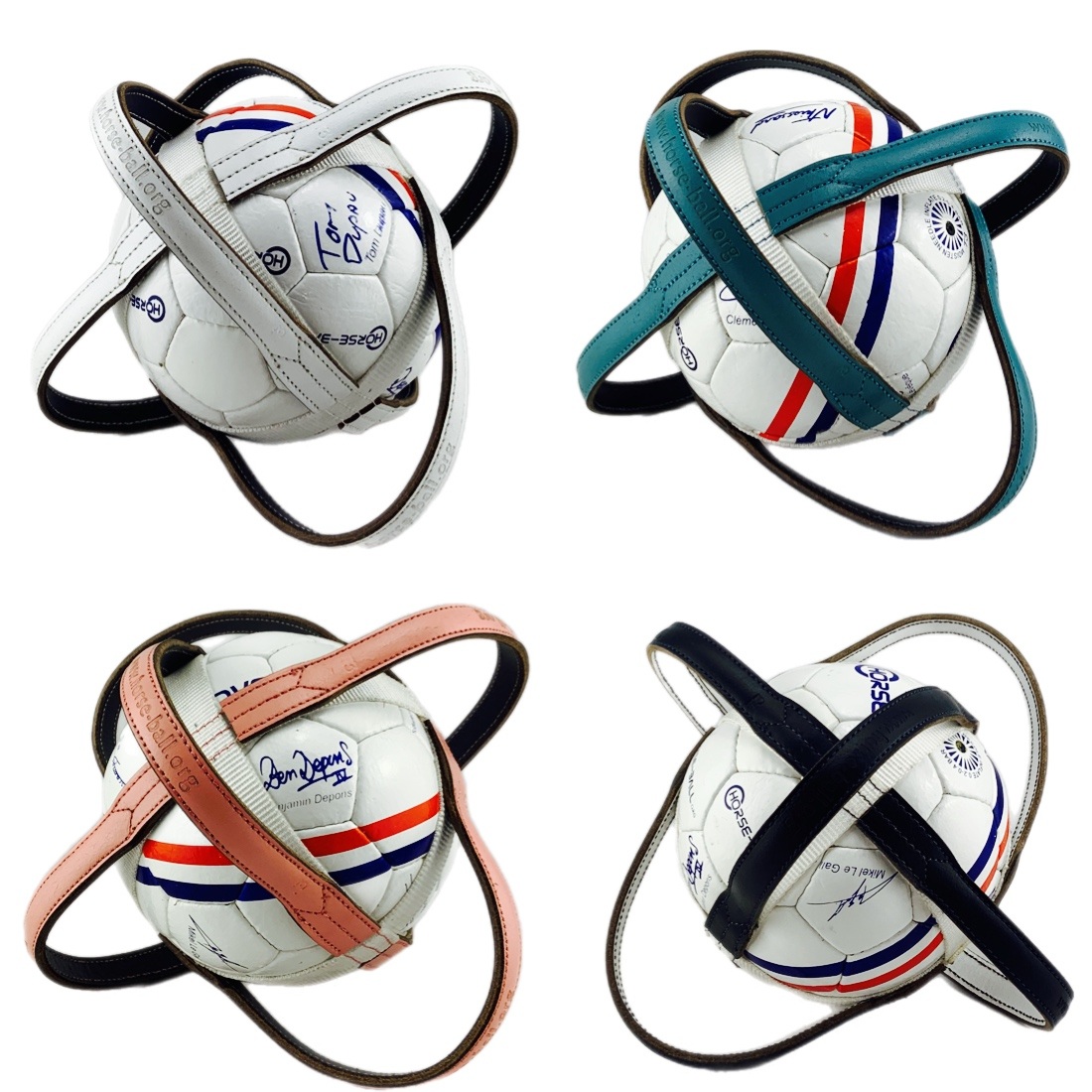 Ballon de horse ball réglementaire avec les signatures des meilleurs joueurs de horse ball français. Taille 4 (Juniors & Seniors / à partir de 16 ans), Taille 3 (Cadets, Minimes / de 14 à 16 ans), Taille 2 (Moustiques, Poussins & Benjamins / jusqu’à 14 ans). Ce ballon est conforme aux normes en vigueurs, notamment en ce qui concerne ses dimensions mais aussi car il possède des anses constituées de CUIR ce qui est une obligation règlementaire pour une utilisation lors des compétitions ("Le ballon est un ballon de football enserré dans un harnais muni de 6 poignées en CUIR pour permettre le ramassage et l’arrachage"). Ballon avec les signatures des meilleurs joueurs de horse ball français (Tom Dupau, Benoît Lévêque, Clément Haby, , Mikel Le Gall, Nicolas Thiessard, Romain Depons, Jean Baptiste Depons, Valentine Descamps, Margaux Bouchery).